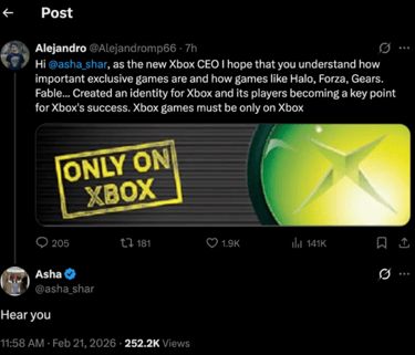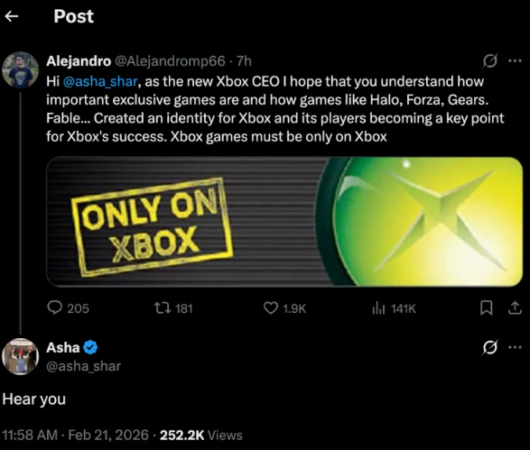 Po to, kai dalis „Xbox“ žaidimų pasirodė „PS5“ ir „Switch“ platformose, žaidėjų bendruomenė sunerimo dėl konsolės ateities. Tačiau naujoji „Xbox“ generalinė direktorė Asha Sharma, perėmusi pareigas iš Philo Spencerio, siunčia viltingą signalą. Atsakydama į gerbėjo prašymą vėl kurti žaidimus, skirtus tik „Xbox“ konsolei, ji užtikrino: „Aš jus girdžiu“.