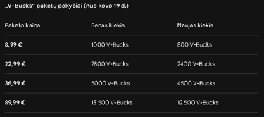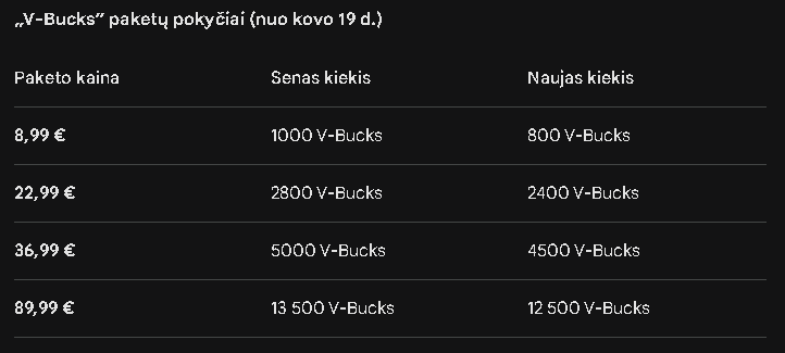 Taip pat keičiasi ir mažųjų papildymų vertė: už 50 „V-Bucks“ dabar teks mokėti 0,99 € (anksčiau kaina buvo 0,50 € mažesnė).