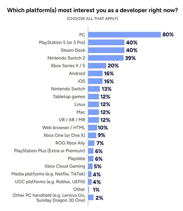 Kompiuterių dominavimas: PC platforma išlieka neginčijama lydere, kuriai žaidimus kurti nori net 80 % apklaustųjų.