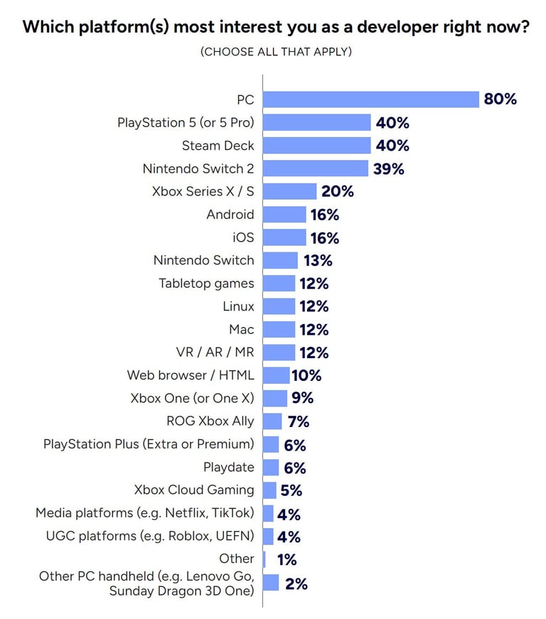 Konkurentų lyderystė: Tuo tarpu „PlayStation 5“ (40 %) ir būsimasis „Switch 2“ (39 %) išlieka pagrindiniais kūrėjų taikiniais.